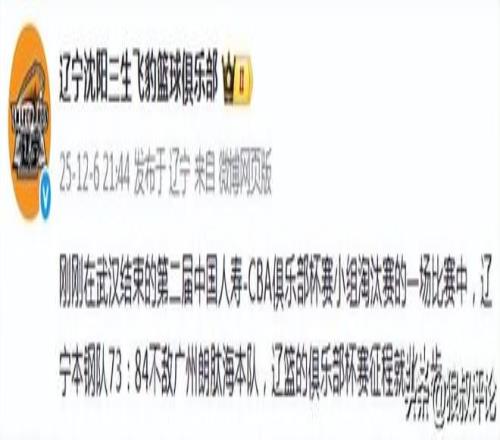 辽宁男篮官方赛后发文:刚刚在武汉结束的第二届中国人寿-CBA俱乐部杯赛小组淘汰赛的一场比赛中,辽宁本钢队73:84不敌广州朗肽海本队,辽篮的俱乐部杯赛征程就此止步。