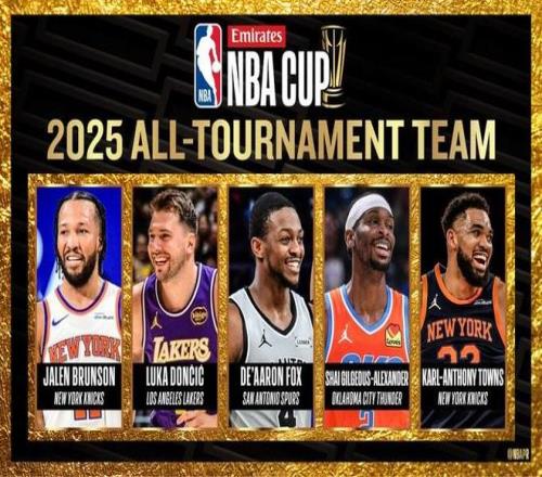 在最佳阵容中,杯赛MVP布伦森领衔,队友唐斯也入选。东契奇作为唯一一个非四强球队入选了阵容。